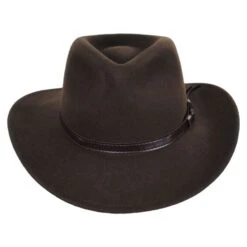 The Aussie-inspired Olive Green Crushable Wool Felt Outback Hat by Jaxon Hats offers the perfect compromise between a fedora and western hat. A teardrop crown is sleekly embellished with a smooth composite leather hat band while its generous brim curves at both the front and back. Made of soft 100% wool felt, the Jaxon Hats Crushable Outback is both crushable and naturally water repellent – perfect for anything the Outback or great American West may throw your way.