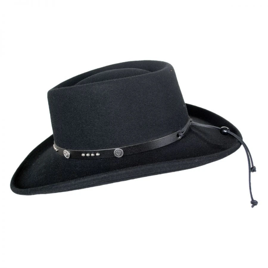 Introducing the Joker LiteFelt® Wool Gambler Western Hat by Renegade. This is a great wool gambler with a stylish studded leather hat band and curved brim. Made in the USA by expert craftsmen, the Joker features their exclusive wool LiteFelt® finish that makes this style both packable/crushable and water repellent. No stiff hats here! The Renegade Joker Western is for those seeking a bit more flexibility and functionality in their hats, buy yours today!
