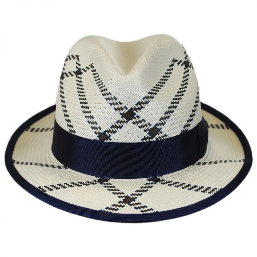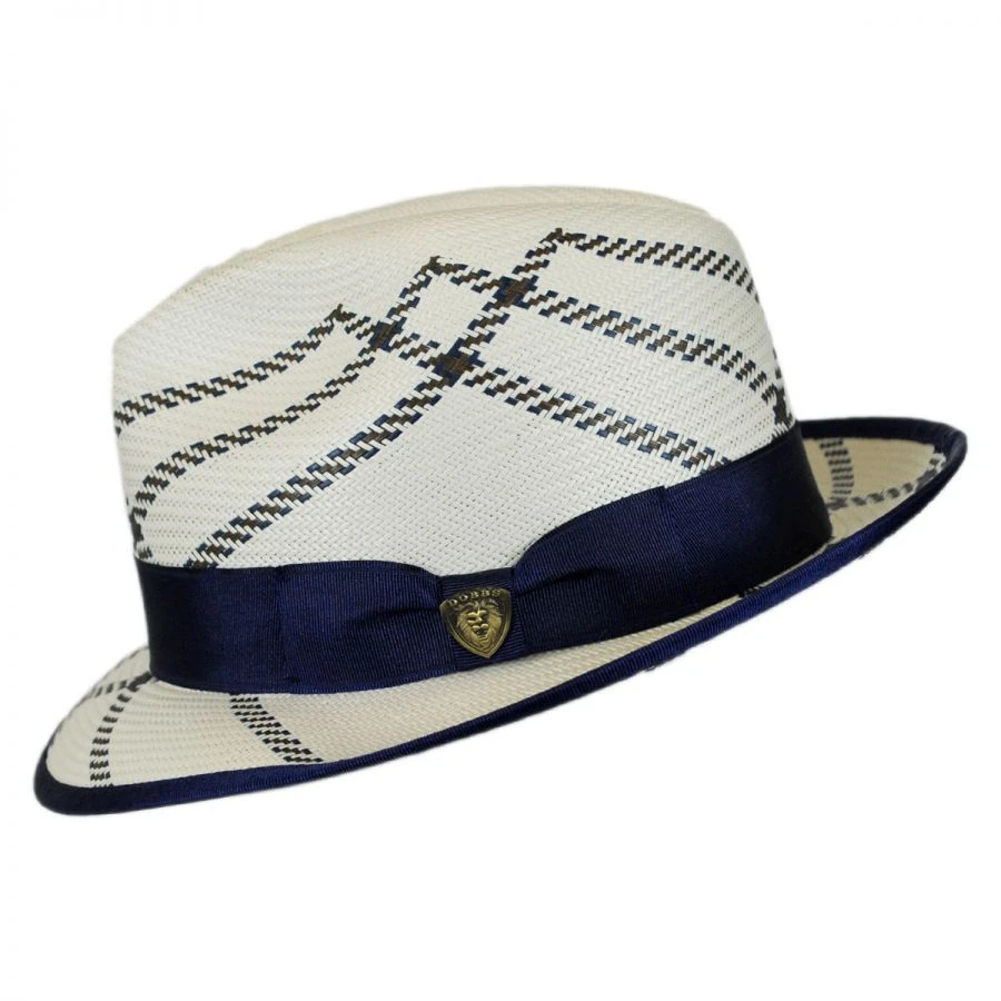 Featuring an attractive navy and bronze inlaid pattern weave, the Rialto Shantung Straw Trilby Fedora Hat is a bold new style by Dobbs. Crafted with a classic pinch front crown, the Rialto is trimmed with a rich deep navy blue grosgrain ribbon hat band and bound brim’s edge. A Dobbs lion side pin, DRI-LEX® absorbent sweatband and Dobbs crown tip complete the look of the uniquely handsome Rialto.