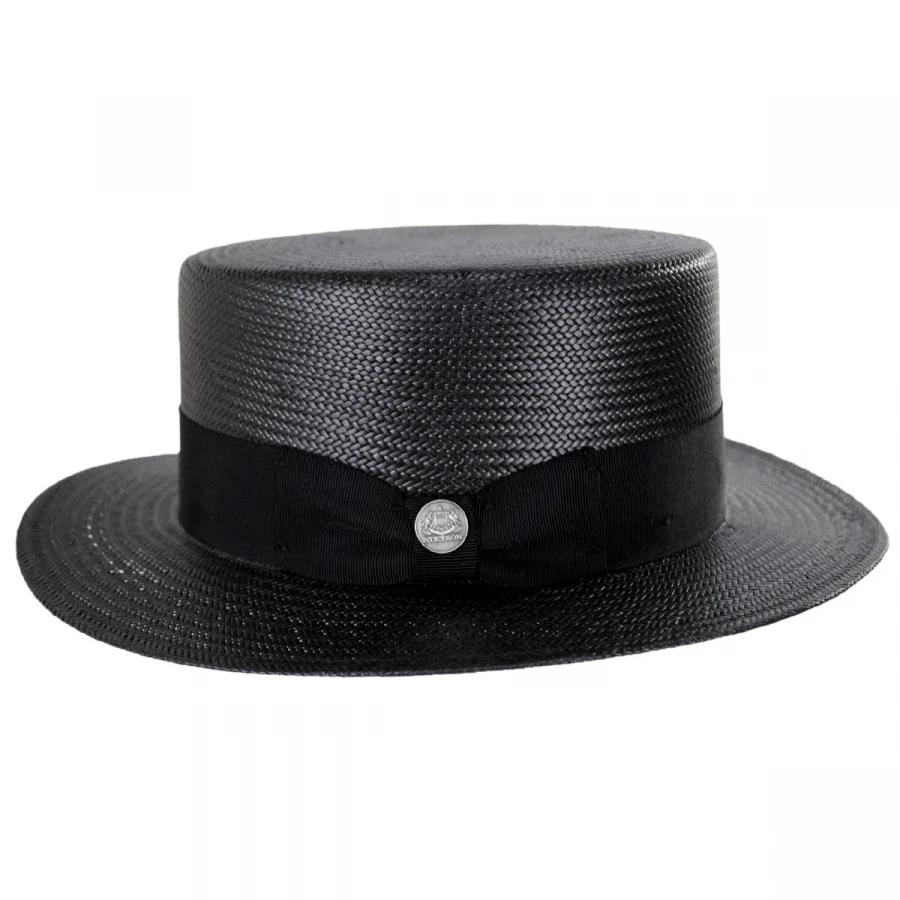 The Keeneland Shantung Straw Skimmer Hat is Stetson’s modern take on the classic skimmer, aka boater. The firm finish shantung straw provides clean straight lines and a lightweight body. Gather up 3 friends and start up a barbershop quartet in head to toe black, topping it off with this stylish straw hat.