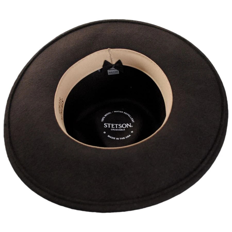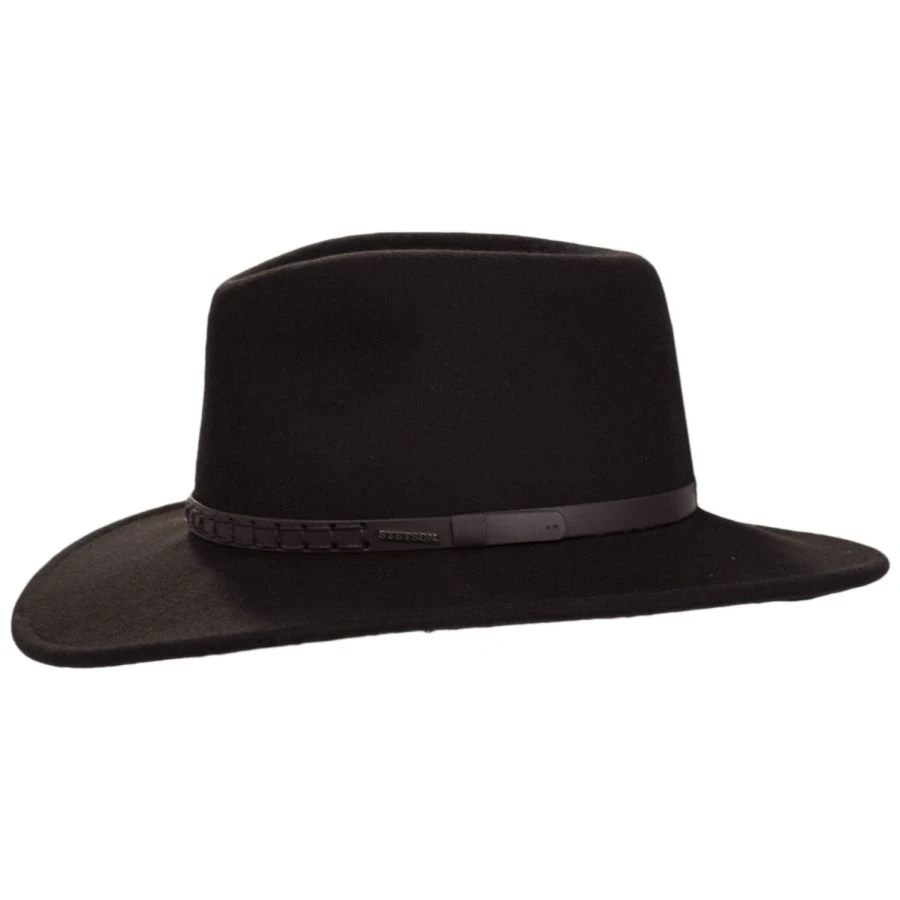 A Stetson original, the Sturgis Crushable Wool Felt Outback Hat, is a classically built outback with a packable/crushable build and a water repellent finish. Made in the USA of 100% wool, the Sturgis. The only accents, a simple leather hat band and a Stetson metal side pin.